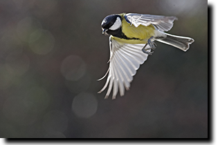 Cette mésange venait de quitter la mangeoire et j'ai réussi à déclencher assez vite pour qu'elle soit dans le cadre. La photo est prise au cours de l'après-midi, lorsque la lumière vient à contre-jour.